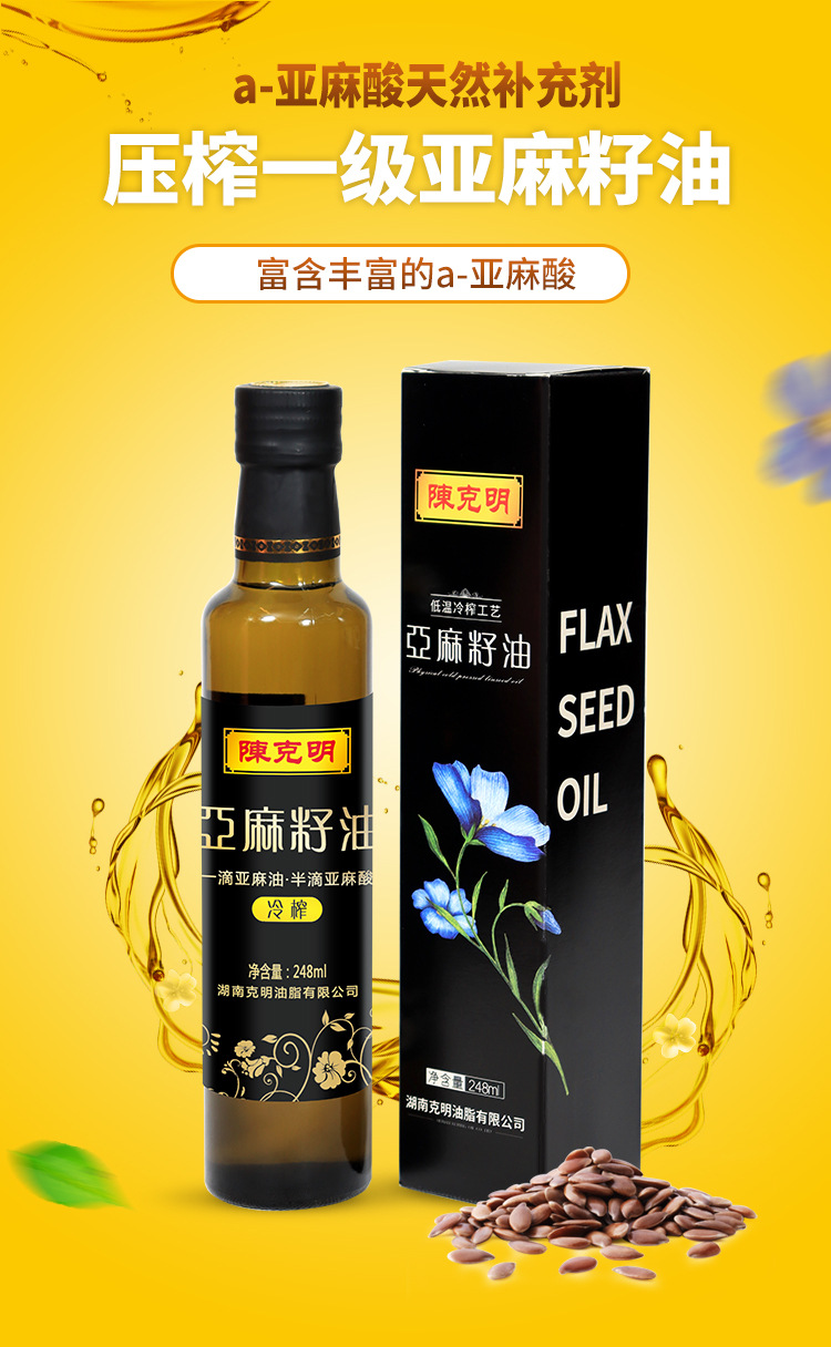 平台首页 > 粮油制品 > 一件代发陈克明亚麻籽油一级冷榨食用油厂家小瓶纯胡麻油礼盒